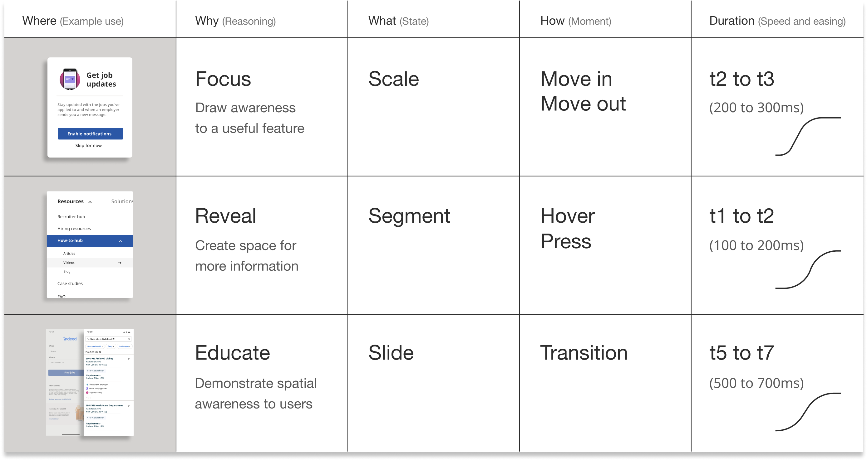 Outside of the most basic interaction states, Indeed lacked clear direciton on why, how, when, and where motion mattered within their product space. To garner user trust while maintaining accessiblity, I developed a foundational system that enabled support throughout the entire job seeker and employer journey.